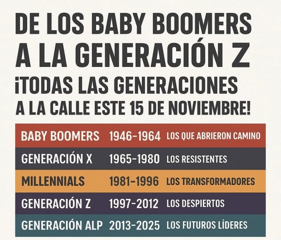 Lo que inició como un llamado de la Generación Z para manifestarse este 15 de noviembre se ha transformado en una movilización multi generacional que reunirá a diversos sectores sociales en distintas ciudades del país. La convocatoria busca visibilizar demandas relacionadas con seguridad, justicia y condiciones en servicios públicos.
